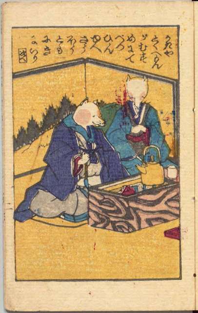 頁をまたいで、旦那さんのお尻部分の着物の色を忘れてしまいました。頁をまたぐと別刷りの木版になるのでミスが目立つ箇所です。背景の薄藍色も異なってます。