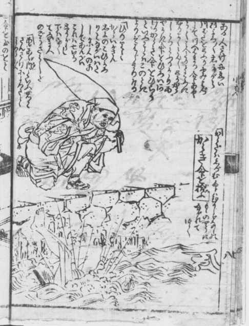 手持ちの桶・盥(たらい)・囲炉裏の鍋に水や湯はなく、あるのはたくさんの書物のみ。変な絵だなと思ったら、これらが聖賢の書物と仏の経文なのでありました。炉端にはこれから鍋に入れる経文があります。その経文の文字まで細かく記してそれっぽくしているところなどこだわりの京伝であります。